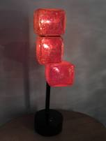 The "FireboxX" series is a new series of table lamps, floor lamps and large totems. The lit cubes are created using a special technique that encapsulates thousands of bubbles. The bubbles in the glass cast a facinating pattern of light on the walls around. These lights vary in sizes ranging from a single six inch cube to an eight foot tall totem with 7 12 inch cubes.