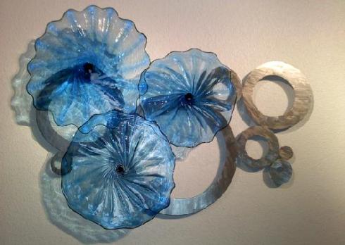 Teal blown glass platters with brushed stainless metal frame.