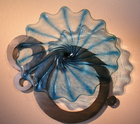 Teal blown glass platter with brushed stainless steel metal frame.